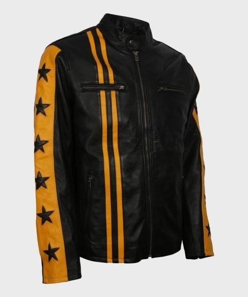 Mens Yellow Star Stripes Cafe Racer Black Leather Jacket